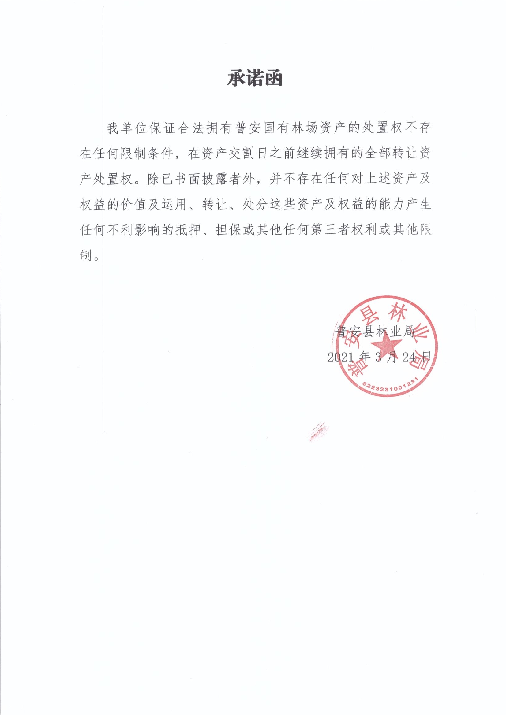 其他信息 | 本項(xiàng)目林地所有權(quán)權(quán)利人為普安國(guó)有普白林場(chǎng),根據(jù)普安縣人民政府專題會(huì)議紀(jì)要(普府專議〔2021〕3號(hào))文件,同意由普安縣林業(yè)局按照國(guó)家相關(guān)政策,規(guī)范辦理轉(zhuǎn)讓手續(xù),國(guó)有普白林場(chǎng)配合做好相關(guān)轉(zhuǎn)讓事宜。 | ||