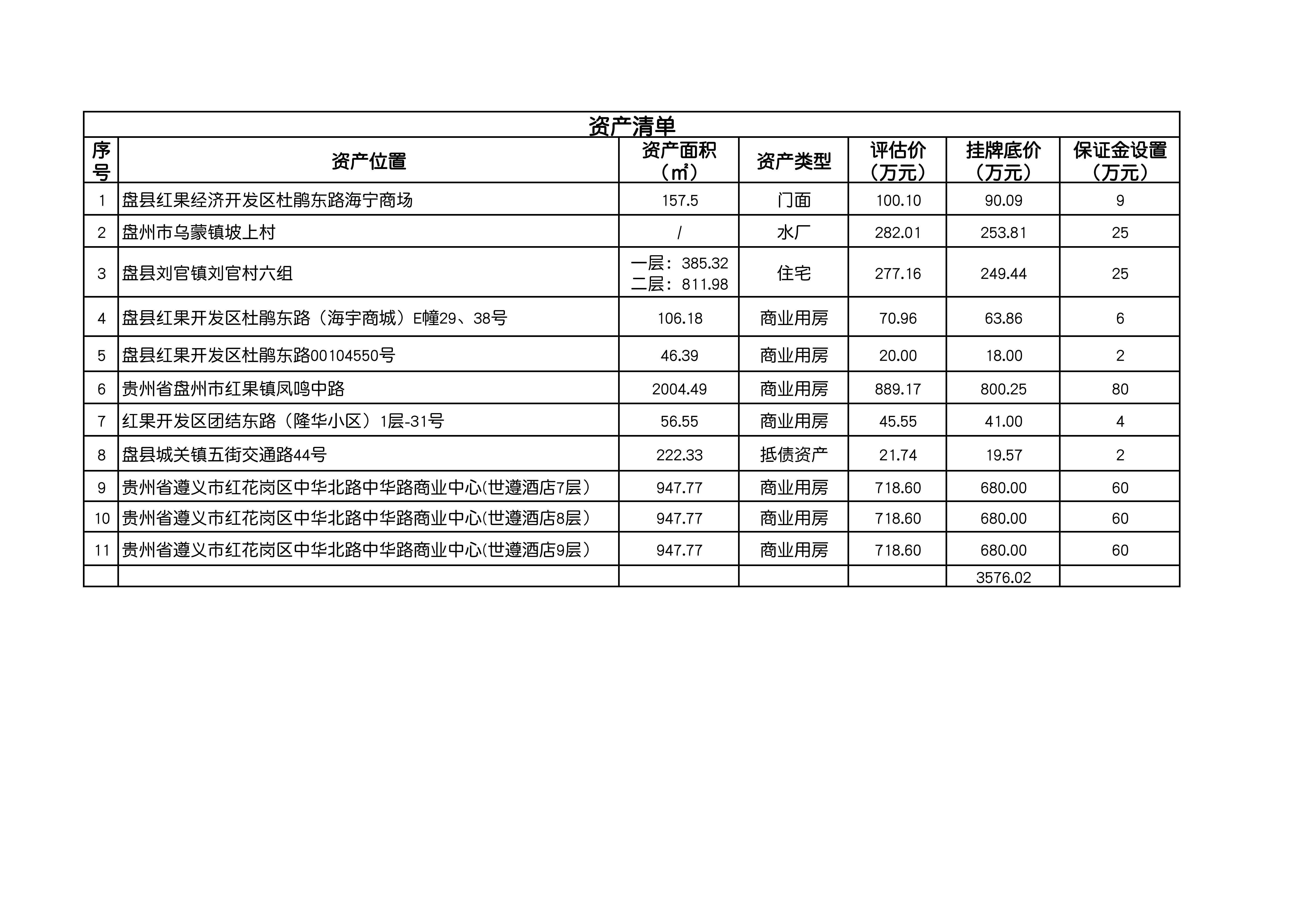 | 資產(chǎn)公告信息 | 資產(chǎn)描述 | 本次擬轉(zhuǎn)讓的資產(chǎn)共計11處,8宗資產(chǎn)位于貴州省盤州市、3宗資產(chǎn)位于貴州省遵義市紅花崗區(qū)中華北路中華路商業(yè)中心(各標的情況詳見附件清單) | ||||||
