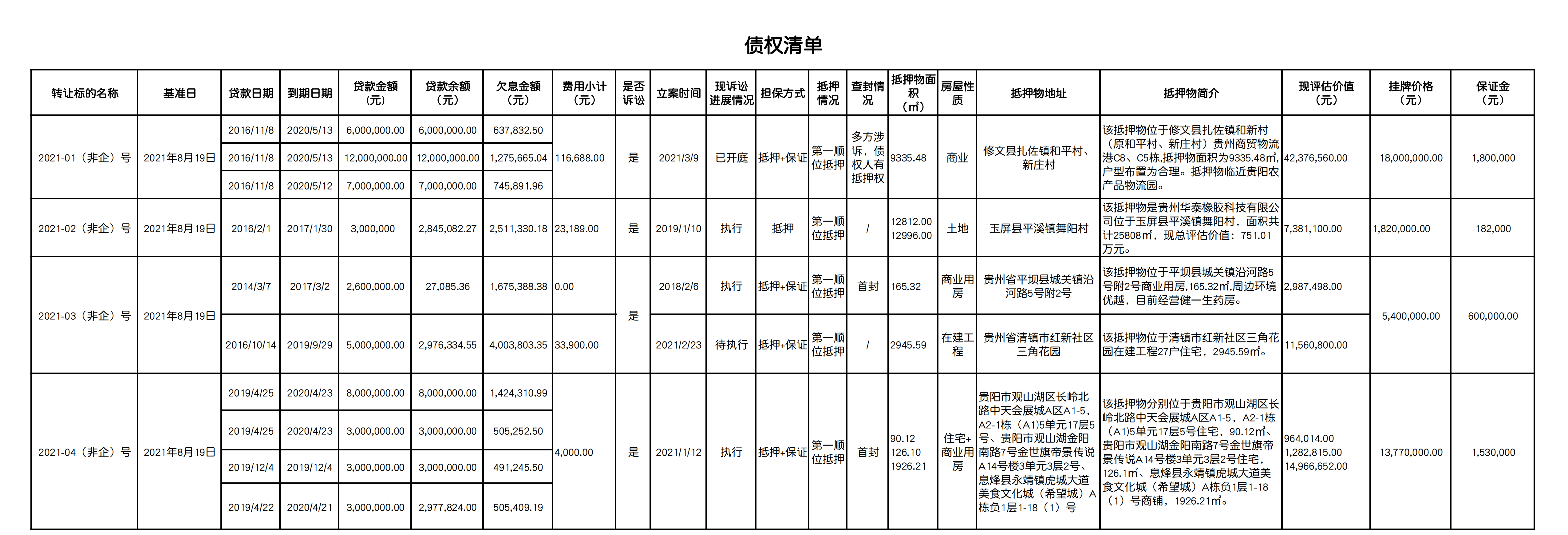 | 標(biāo)的名稱 | 修文農(nóng)商銀行2021-01(非企)號(hào)至2021-04(非企)號(hào)債權(quán) | |||||||